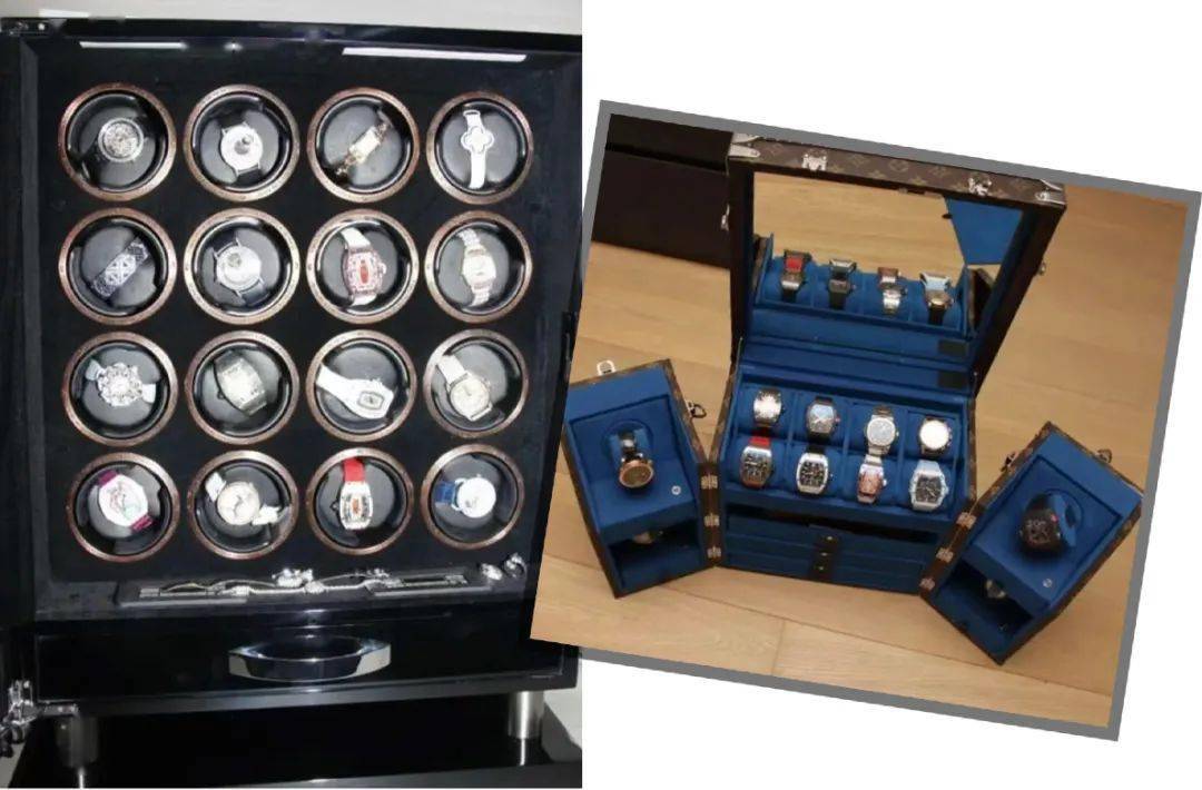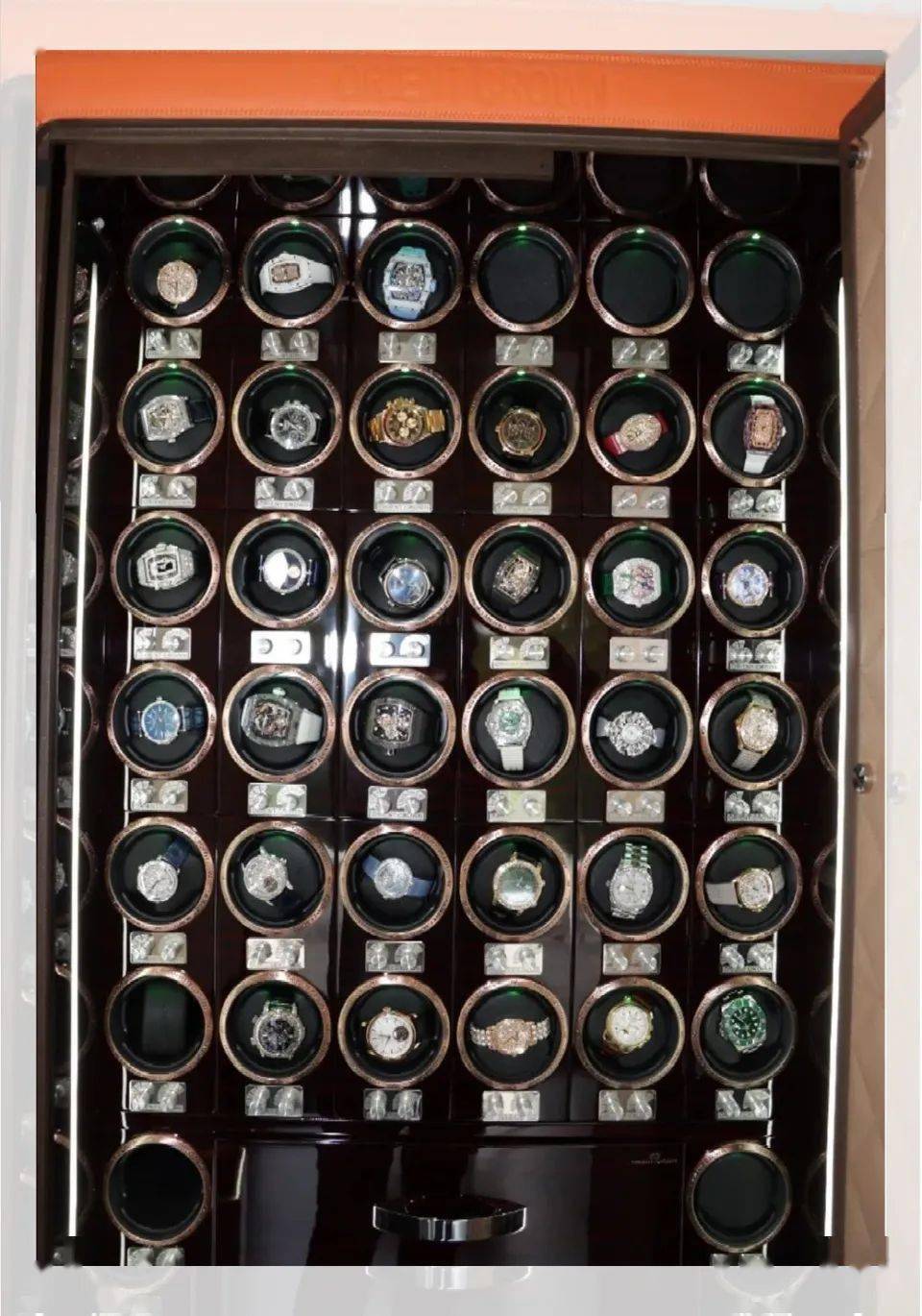 要说最让人瞠目结舌的就是这些手表了,外媒统计300余只,光是这箱里均价百万的RM就有九块,同时还有梵克雅宝开花表,百达翡丽三问万年历、钻圈金螺、劳力士彩虹圈迪通拿以及其他大牌钻表若干。