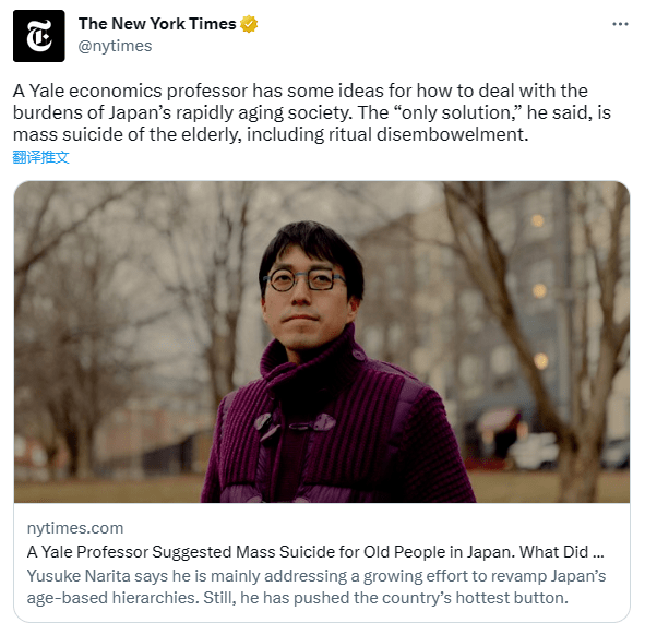 2021年,日本网红经济学专家成田悠辅,曾在新闻节目中公开支招:”最终还要靠老年人集体自杀、一起切腹。”甚至还称,未来可能对老人强制安乐死。