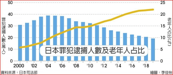 2020年,日本法务省发布的白皮书显示:日本65岁以上老人的犯罪率,已占22%;至于重复犯罪率,更是高达70%。