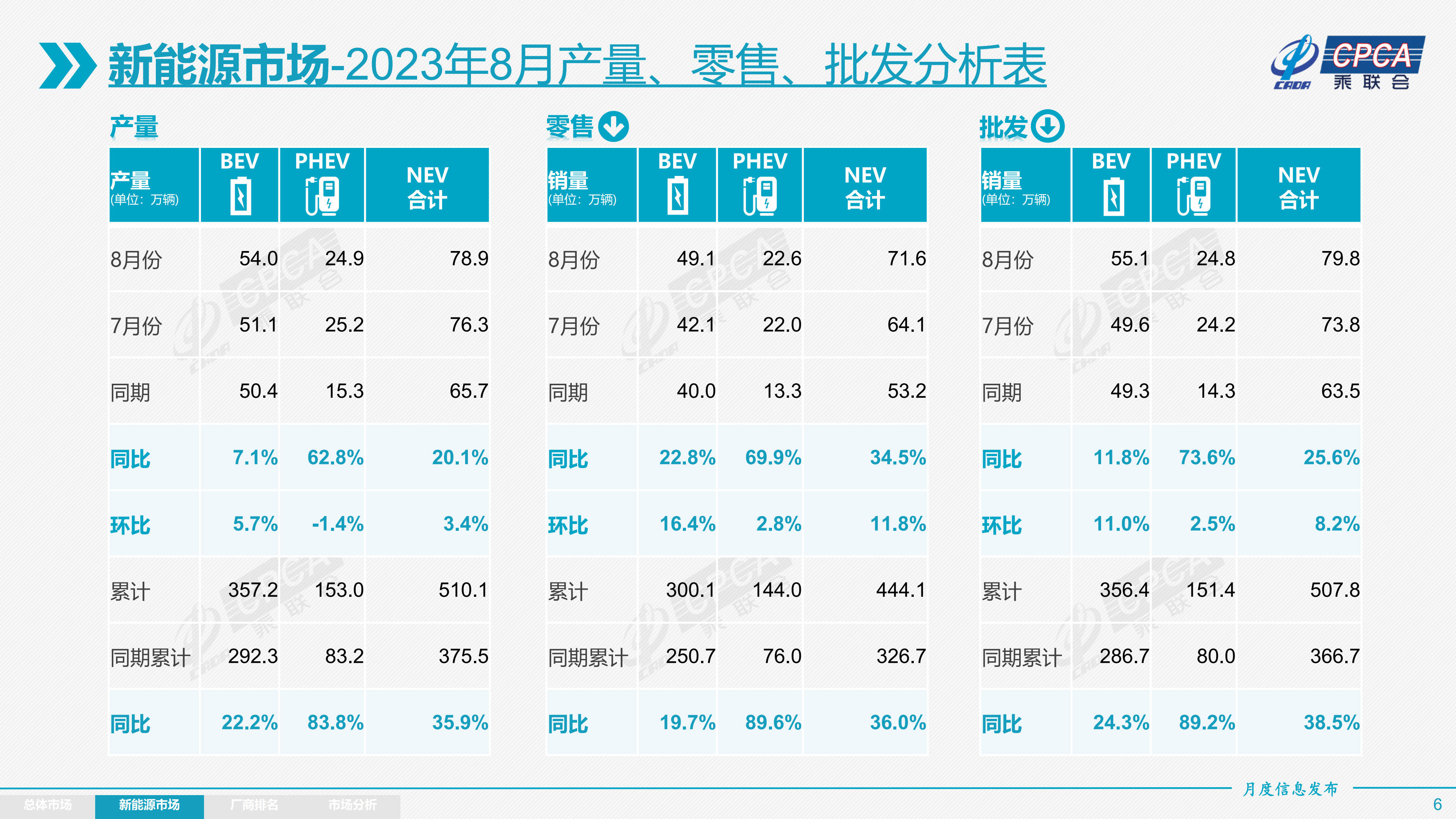 8月新能源乘用车批发销量达到79.8万辆,同比增长25.6%,环比增长8.2%。今年以来累计批发507.8万辆,同比增长38.5%。8月新能源车市场零售71.6万辆,同比增长34.5%,环比增长11.8%。今年以来累计零售444.1万辆,同比增长36.0%。