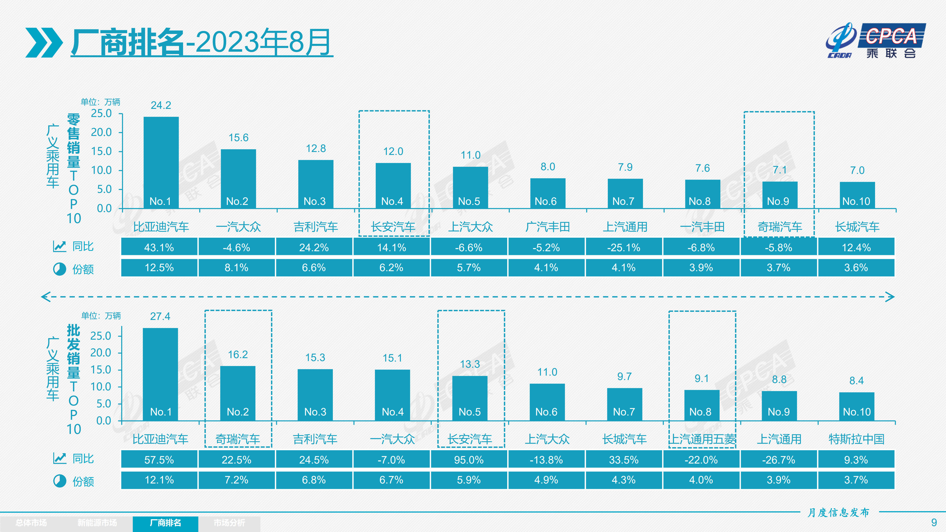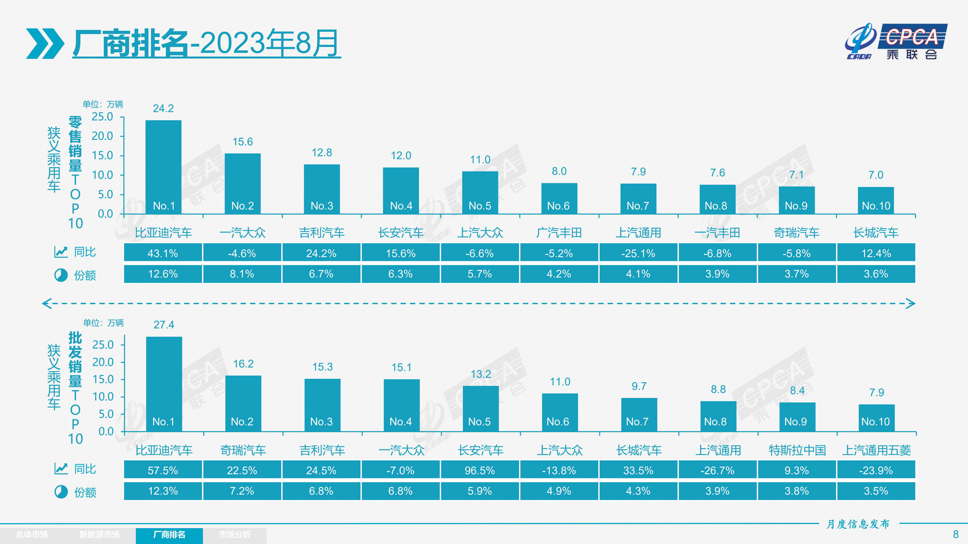 广义乘用车零售销量:8月前三名分别是比亚迪汽车、一汽-大众、吉利汽车。