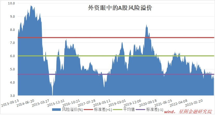 当然,换回内资视角,基于10年期中债收益率看A股,风险溢价很高,接近“均值+1倍标准差”的位置,持有A股很划算;但外资用10年期美债收益率看A股,风险溢价很低,持有A股不划算。标尺不同,资金成本不同,结论截然相反。