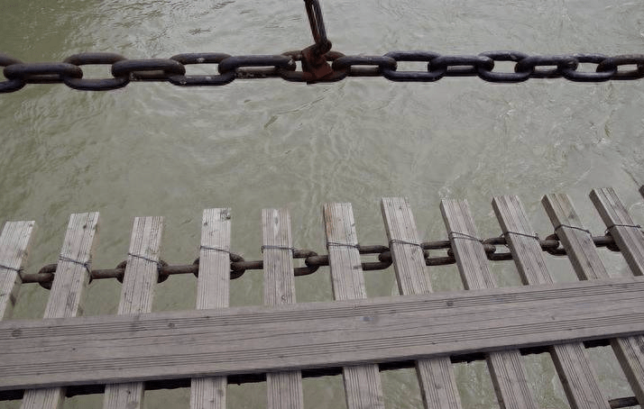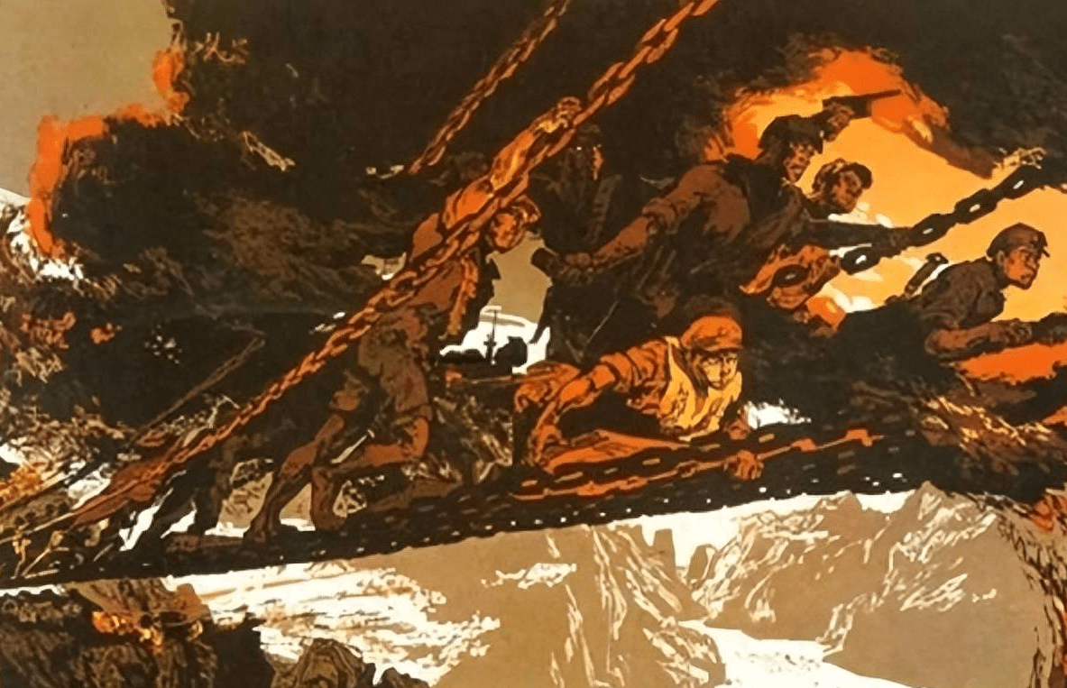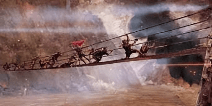 29日清晨,他们终于赶到泸定桥,却惊奇的看到桥上原本的木板已经被敌人拆除,只剩下13根冰冷的铁索横跨两岸,而对面则是敌人射下的埋伏。