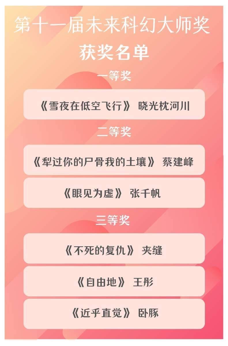 在本届“未来科幻大师奖”中,晓光枕河川凭借科幻小说《雪夜在低空飞行》夺得一等奖,该作品以哲学观照为创作主旨,探讨了在特定环境下人性的善恶与文明的觉醒。二等奖颁给了创作《犁过你的尸骨我的土壤》的蔡建峰和创作《眼见为虚》的张千帆。夹缝的《不死的复仇》,王彤的《自由地》,卧豚的《近乎直觉》获得“未来科幻大师奖”三等奖。