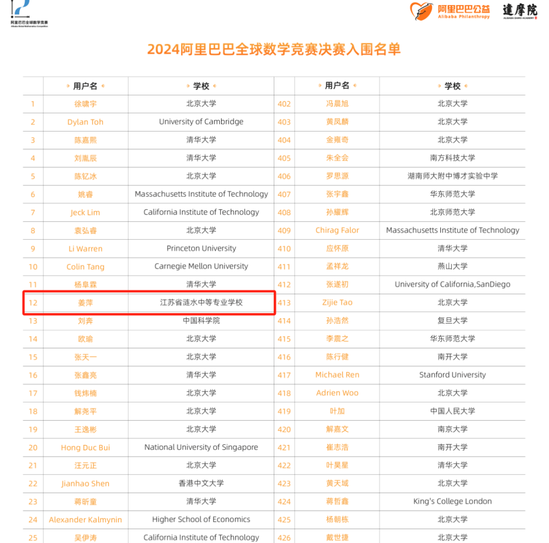 而排在姜萍前后的入围选手,有来自北大、清华、中科院的高材生,还有来自麻省理工、普林斯顿、卡梅等海外高校的留学生,其中不乏IMO金牌得主。姜萍的名字,在其中格外显眼。