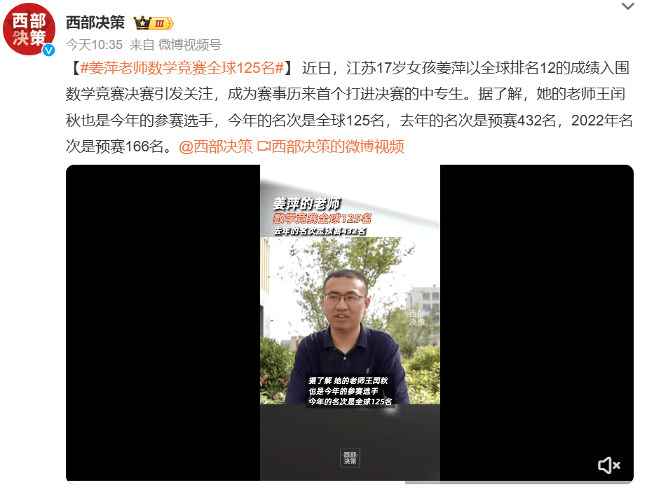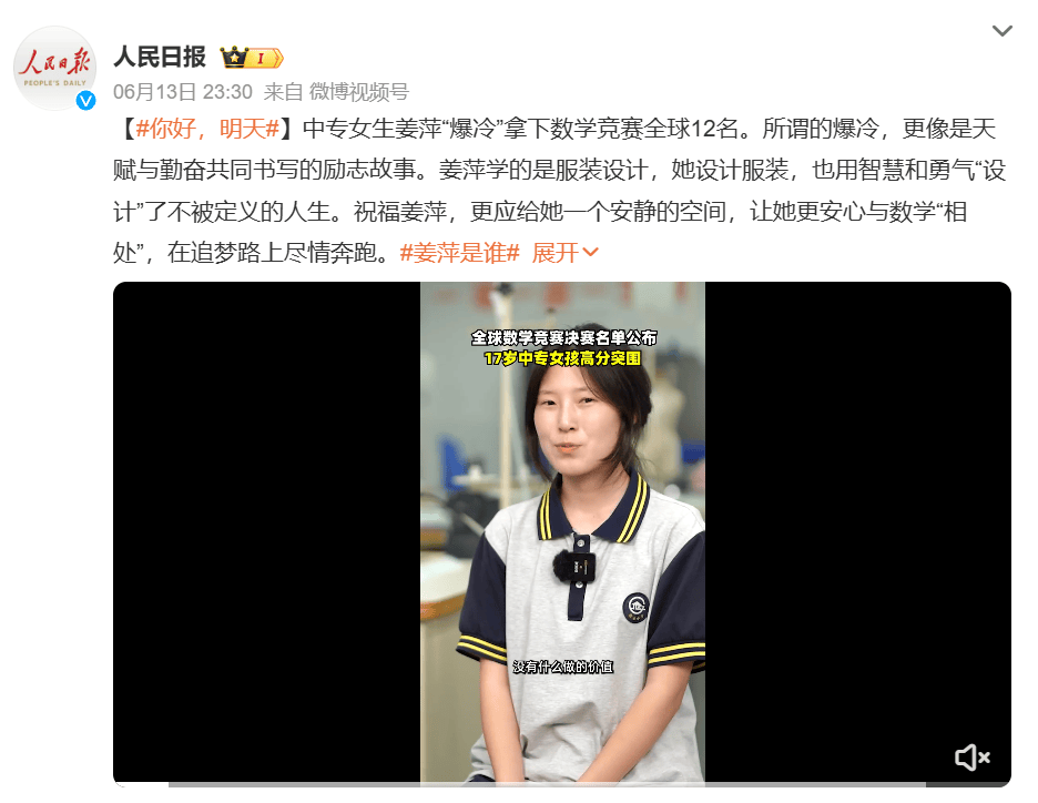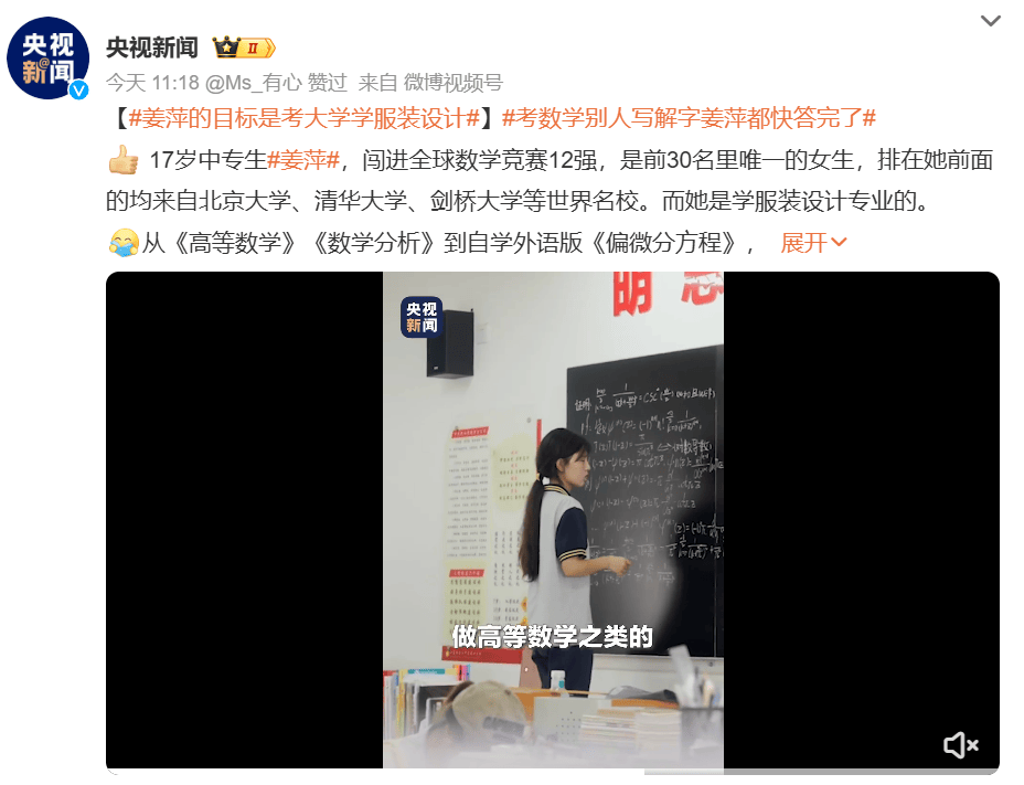 拿下全球第12名的好成绩后,姜萍一鸣惊人,她的数学天赋和对自强不息的努力,获得了大家的认可。