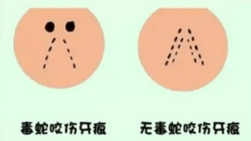 大部分毒蛇拥有两颗尖尖的大牙,中部为空心,咬伤人后,通过尖牙将毒液注入人体内。因此,如果伤口呈现两个明显的牙印,极有可能便是毒蛇;无毒蛇的牙印大多是两排如虚线一般的细印。